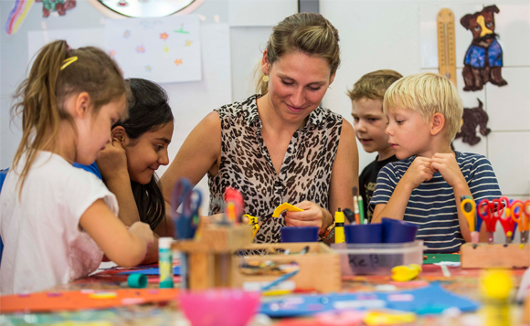 Pädagogin Lisa Geyer unterstützt die angehenden Erstklässler beim Erwerb des Scherenführerscheins (Foto: René Ruprecht)