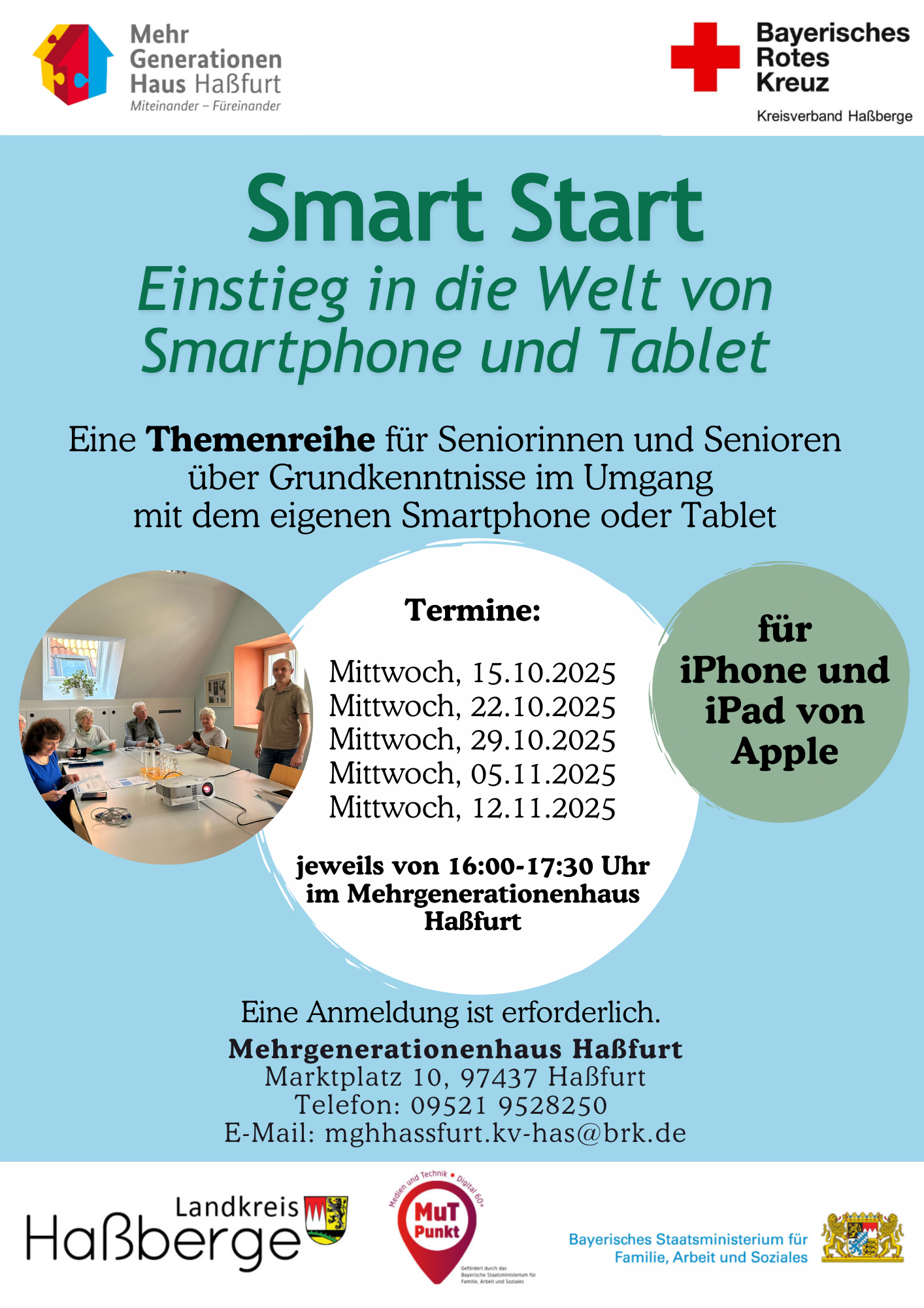 Die Teil­nah­me ist kos­ten­los, eine vor­he­ri­ge An­mel­dung ist er­for­der­lich: te­le­fo­nisch un­ter 09521 952825–0 oder per E‑Mail an: mghhassfurt.kv-has@brk.de .