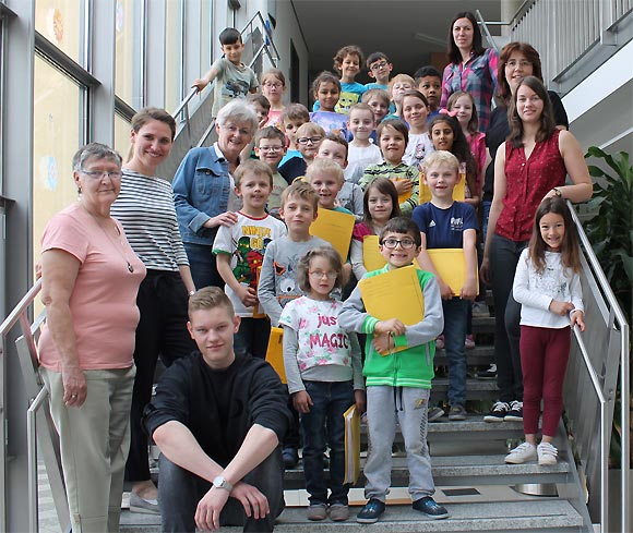 Die Schülerinnen und Schüler der drei ersten Klassen gemeinsam mit den Lehrerinnen (auf der rechten Seite von unten nach oben) Cornelia Tröster, Christiane Rauschmann und Carolin Neumann; (auf der linken Seite von unten nach oben) die freiwillig Engagierten Lesepaten des Mehrgenerationenhauses Jan Schneider, Gabriele Vogel, Rita Wohlleben, Lisa Geyer Stv. Leitung im MGH (dritte von unten). (Foto: Jana Obuchowski)
