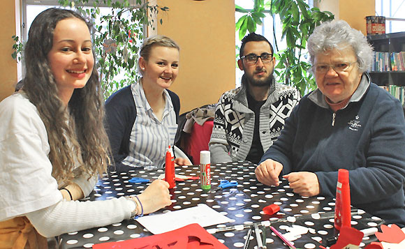 Barbara Kram, Theresa Krapf, Mohannad Batha und Edeltraud Heymann basteln und unterhalten sich gemeinsam im MGH-Sprachcafé (Foto: MGH)